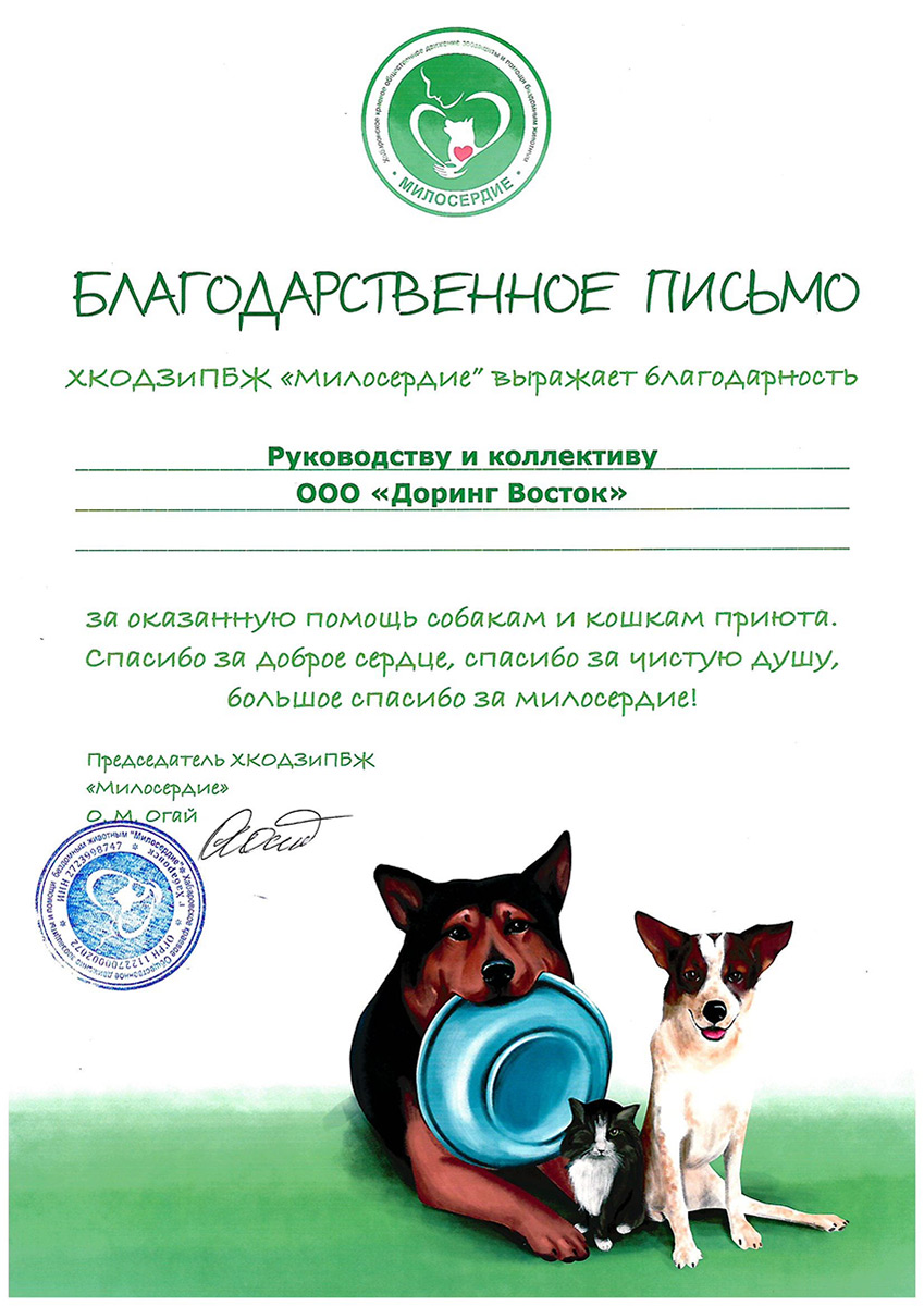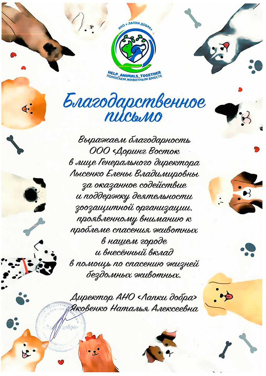 «Доринг Восток» с удовольствием участвует в помощи бездомным животным и приютам через свой собственный благотворительный фонд «ДоброДом».