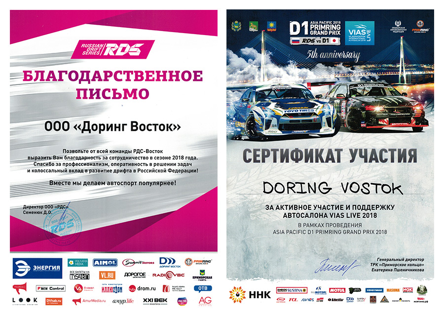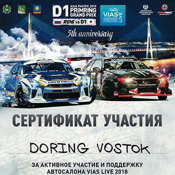 Компания ООО «Доринг Восток» стала официальным партнером всероссийских соревнований по дрифту «RDS Восток 2018» и «RDS GP 2018». Также она приняла участие в качестве партнера в международных соревнованиях «Asia Pacific D1 Primring GP 2018», где в управляемом заносе соперничали лучшие российские спортсмены и мастера основателей гонок из страны Восходящего Солнца - Японии.